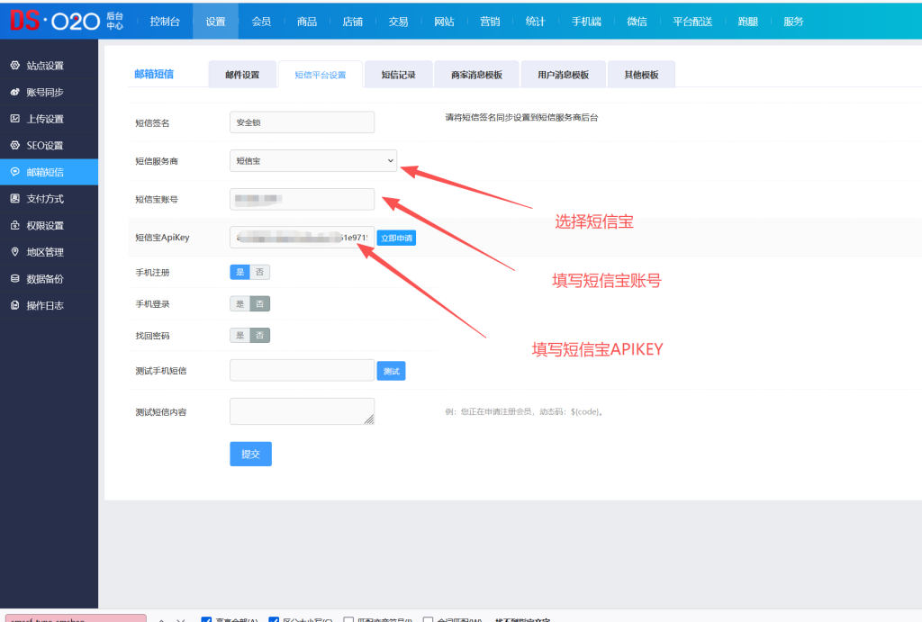 四:进入系统后台->设置->邮箱短信->短信平台设置 ,填写短信宝配置信息即可。