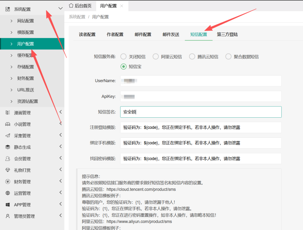 3:进入系统后台->系统配置-》用户配置-》短信配置,选择短信宝,配置短信宝账号, APIKEY,短信签名相关信息并保存
